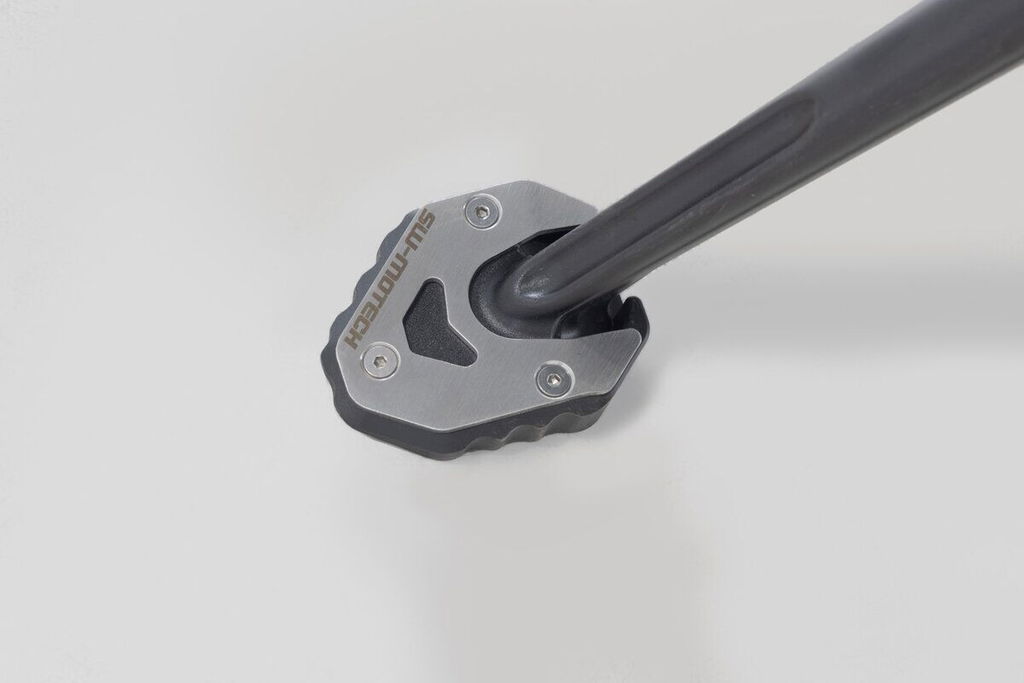Sidestand Foot ExtensionThis durable foot extension has a large contact surface for enhanced stability, even on uneven ground and soft soil Side stand foot with doubled contact surface (bike specific) Simple mounting onto the original side stand using three screws High-quality workmanship: CNC-milled, made of anodized aluminum alloy and corrosion-resistant stainless steel