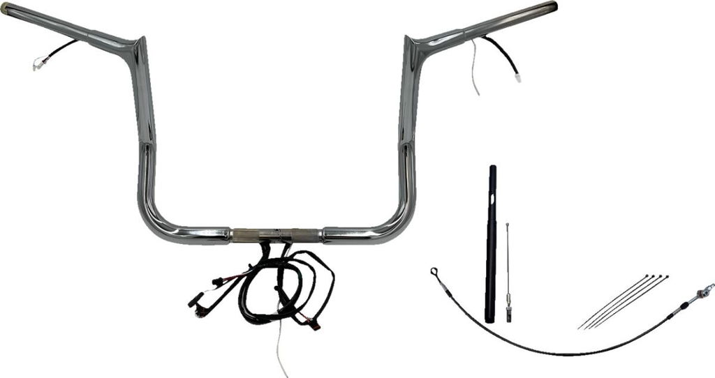 EZ Install Wired 1-1/4" Pointed Top Handlebar KitWired for your handlebar controls, including a throttle-by-wire sensor installed Remove the bars from the box and plug them into your motorcycle No more need to fight internal wiring with our handlebars: you can install wiring in minutes Non welded top corner is machined from billet steel with a smooth internal wire cavity that won't damage the internal wiring CNC mandrel bent from 1-1/4" Dia. x .120" wall heavy tube Bolt-together, 2-piece handlebar takes up half the shelf space Made in the U.S.A. Does not replace existing lines and cables, but extends them. Accepts OEM heated grips. Heated Grip Extension sold separately. All '21-'23 kits will include black brake lines and black clutch extensions.