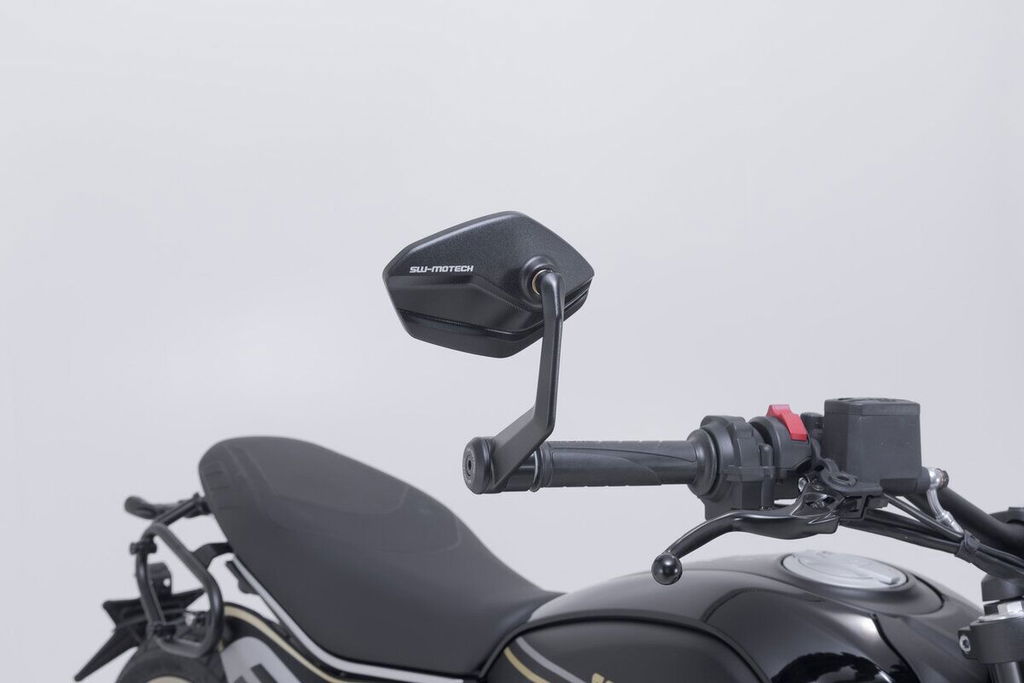 Bar end MirrorsThe mirrors are made from forged, milled and black anodized aluminium and feature engraved logo details. Thus, they add a robust yet elegant touch to your handlebars. The aerodynamically designed wrap-around arm and the timeless, simple design of the mirrors blend perfectly on either modern naked sport bikes or modern retro-styled scramblers or café racers. The ball head behind the mirror housing enables precision and versatile adjustment of your field of view so that you always have a clear view of what is happening behind you. Together with the mounting parts included in the sets, they can be fitted to your motorcycle with a perfect fit and ensure a high-quality and harmonious appearance thanks to carefully selected and coordinated surfaces. The ultimate in visibility: swap standard for premium and enjoy the attention your motorcycle will attract in the parking lot with these exclusive mirrors and always keep a safe eye on your passengers on the road. Made from high-quality forged and black anodized aluminium. Modern edge design with re-milled sections. Ball head behind the mirror housing with large adjustment range ensures precise alignment of the field of vision. Mirror arm length: 157 mm. All components required for mounting on your motorcycle are included in delivery, including attachment of the brake fluid reservoir if required. Cover caps for the threads of the original mirrors included in delivery. Scope of delivery: 1 x Mirror Set Sport, 1 x mounting instructions and mounting material.