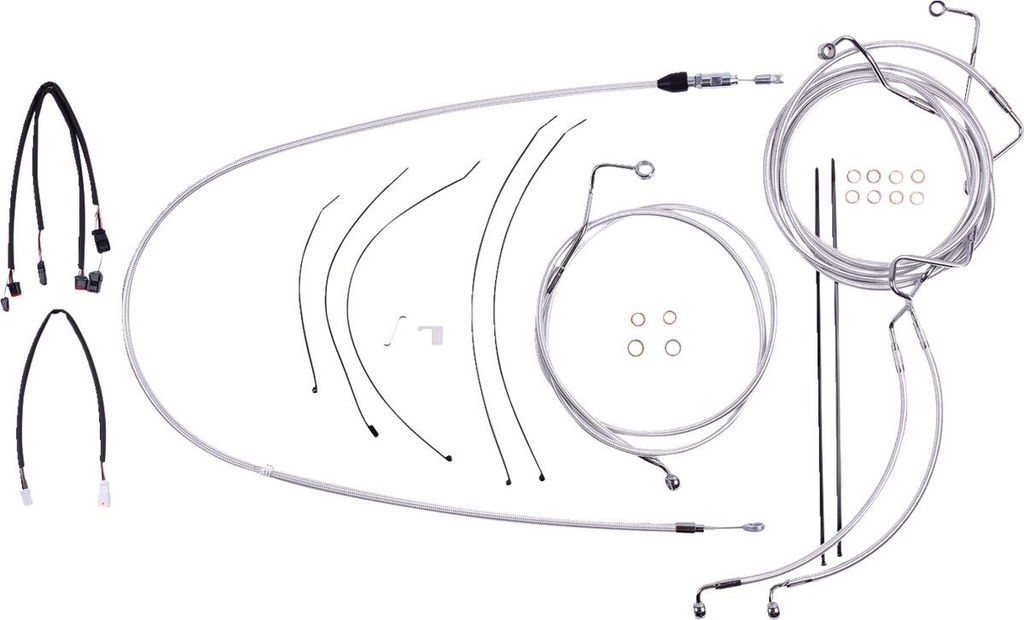 Sterling Chromite II® Designer Handlebar Installation KitThe only complete kit with matching braided cables and brake lines Kit includes throttle and idle cables of throttle-by-wire extensions, clutch cable or hydraulic clutch line, brake lines, copper crush washers, hardware, and any necessary switch wiring of turn signal extension All cable and brake lines feature Sterling Chromite II® braid with highly polished chrome plated fittings Brake lines are constructed with PTFE inner tubing, DuPontTM Kevlar® aramid fiber, premium Signature Magnum braids, and an outer PVC jacket All cables are a low-effort, high-efficiency design that meets or exceeds all OE specifications for fitment, construction and endurance Kit for dual disc models includes an all brazed manifold that eliminates leaks, alignment problems and unattractive threaded connections Brake lines are compliant with all DOT FMVSS-106 Specifications Assembled in the USA Kit is based on using ape hanger style handlebars with 2” risers.