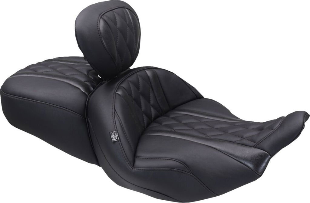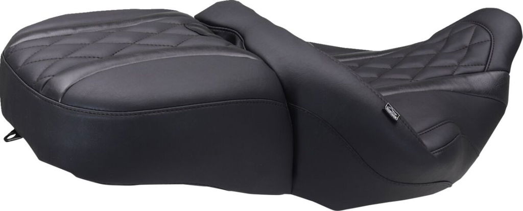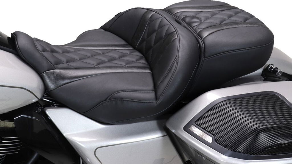 Deluxe Touring SeatTop covering made of highest-quality expanded vinyl and baseplate is marine-grade fiberglass Deluxe diamond pattern The front seat places the rider in a position similar to stock but sets the rider back 1/2" with an ergonomic angle for improved touring posture and enhanced comfort One-piece, 2-up for a comfortable ride for passenger and driver