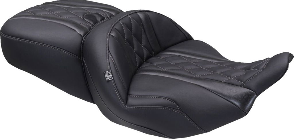 Deluxe Touring SeatTop covering made of highest-quality expanded vinyl and baseplate is marine-grade fiberglass Deluxe diamond pattern The front seat places the rider in a position similar to stock but sets the rider back 1/2" with an ergonomic angle for improved touring posture and enhanced comfort One-piece, 2-up for a comfortable ride for passenger and driver