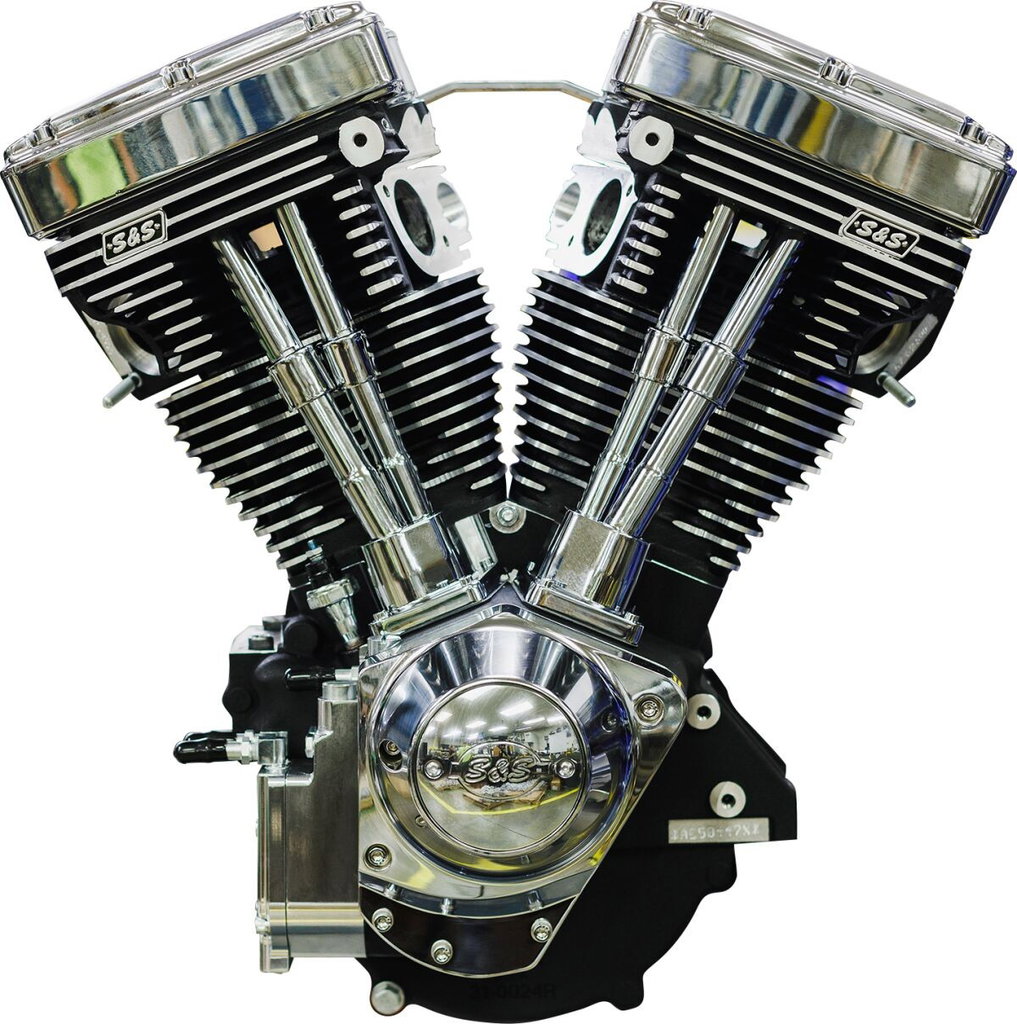 V124 Long Block EngineFor '84-'99 Evolution Big Twin or '70-'99 custom chasis with alternator-style primary Specially machined cylinder heads allow use of stock length manifold, use your existing carb (re-jetting is required) Designed to bolt into stock or aftermarket EFI, carburetor or air cleaner Crank and case machined for crank position sensor Includes S&S cylinder heads, S&S valve springs, forged rocker arms, 640 cam, three piece flywheel assembly, 1.671" diameter crankpin, 0.927" wristpins, high-volume high pressure oil pump, electric compression releases and forged pistons Made in the USA Will require a performance ignition and performance carburetor. Includes chrome billet timing covers.