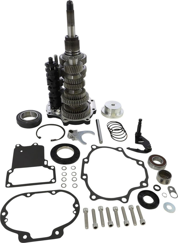 7-Speed Transmission Gear SetDirect replacement of the Cruise Drive Harley-Davidson factory 6-speed The 7th gear enables the motorcycle to make full use, by the way of gear ratio management, of the torque and power put out by the 96 ci, 103 ci and 110 ci motors Unlike the stock mainshaft which includes 1st through 4th gears, the DD7 is lightweight and only includes the small 1st gear, minimizing the shift clunk Features a shortened 1st gear and tightened all other gears for a smooth and powerful riding experience with continuous acceleration from 1st to 4th gear Shift smoothness is achieved by use of a new linear roller ball detent which is part of the supplied billet top cover Comes ready to slide in the bike, no case modifications, shimming of the gear set or adjustments required 7th main drive gear, main drive gear bearing, main drive seal are all included to replace 6th main Includes new main drive gear bearing and seal, polished door, door gasket, side cover gasket, top cover gasket and self-adhesive DD7 side cover emblem Bearing door is manufacturered from 6061-T6 Aluminum and features wider bearings and a bearing retainer plates instead of the stock style snap rings ARP 12 point bolts for door, top cover, stock side cover; Baker re-cal box and leads are all included DD7 door bearings are 28% wider than stock Utilizes F6F door bearing retainer plate Reuses stock shifter pawl Made in the USA