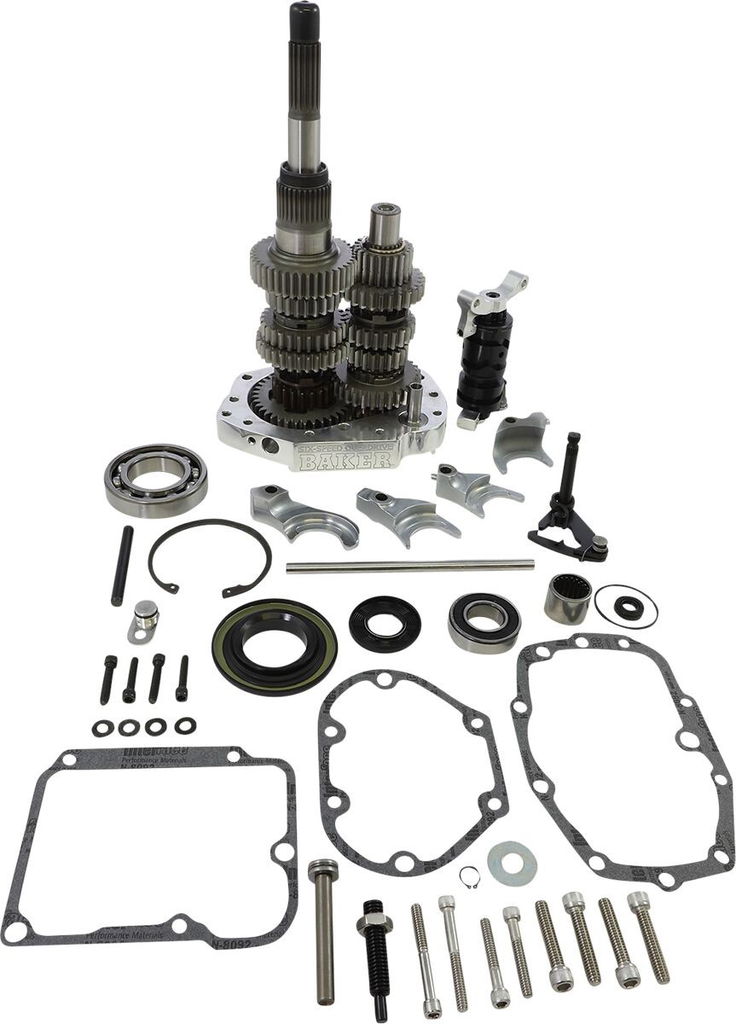 Overdrive 6-Speed Gear SetIncludes trap door, all gears, mainshaft, countershaft, shifter drum, detent components, bearings, snap rings, gaskets and hardware Significantly smoother shifting than stock due to a roller detent shift drum with reduced inertia and gear dogteeth with lead-in ramping Bearing door is manufactured from 6061-T6 Aluminum and features wider bearings and a bearing retainer plates instead of the stock style snap rings Gearsets are made out of 8620 steel, gears are cut before heat treating then precision ground with a diamond coated tooling for quieter operation Lower RPM's for smoother highway speed operation and increased fuel efficiency Made in the USA Exhaust bracket may require modification when using these kits. Fits into stock and most aftermarket 5-speed transmission cases. Recalibration of electronic speedometers (see part 2210-0391) needs to be completed after installation of the transmission kit.