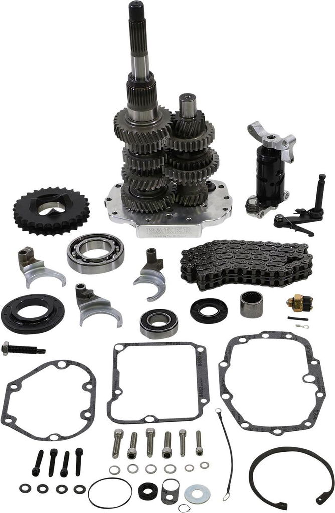 Direct Drive 6-Speed Gear SetIncludes a trap door, 6-speed gear set (3.24:1 1st gear/.86:1 6th gear), 28-tooth motor sprocket, longer primary chain, adjusting shoe, fixed spindle-shift drum and anti-overshift ratchet shift pawl assembly Bearing door is manufactured from billet 6061-T6 aluminum and features wider bearings and a bearing retainer plates instead of the stock style snap rings Gearsets are made out of 8620 steel, gears are cut before heat treating then precision ground with a diamond coated tooling for quieter operation All gears are full-width Baker ground gears; 4th, 5th and 6th gears are helical for silent operation Fits into existing 5-speed cases; lowers the rpm at cruising speeds Includes easy-to-follow instructions Smoother, positive, certain shifting More efficient torque-handling Easier-to-find neutral Made in the USA