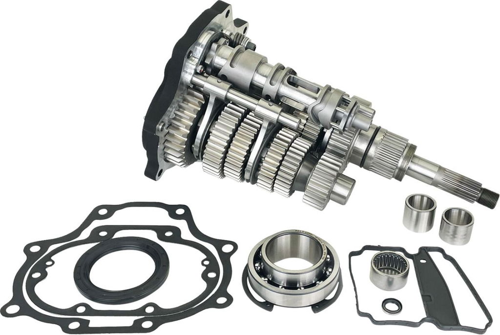 Super Gear KitManufactured from the best aerospace grade 9310 American steel Gear teeth are straight cut with a 53% increase in width when compared to stock, allowing additional load capacity and strength Utilizes JIMS® quick shift ring technology minimizing annoying "clunk" when shifting Teeth are ground to a precise mating profile resulting in a smooth ride with zero gear whine Shafts and gears are assembled into a JIMS® 6061 billet aluminum BIG bearing trap door that reduces flex in high performance applications Bolt in transmissions are compatible with your stock gear selector