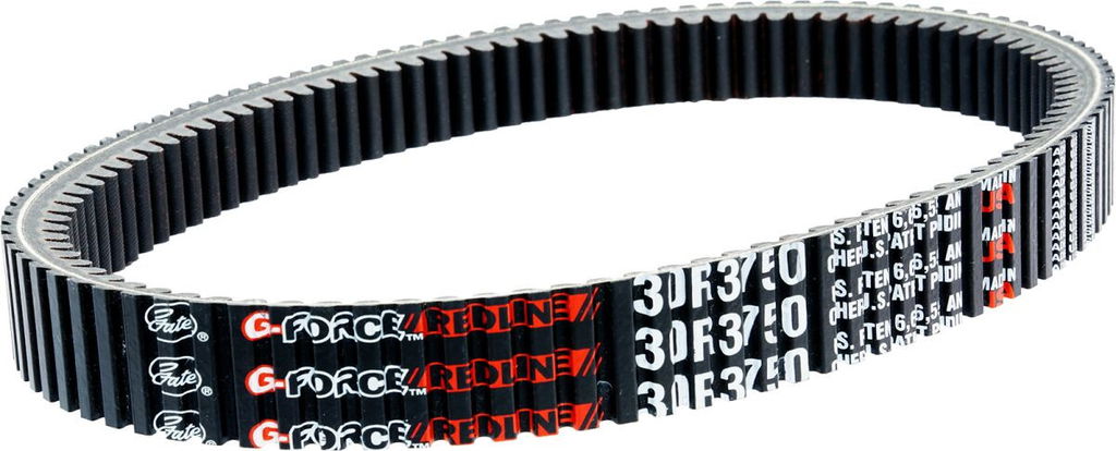 G-Force RedLine™ Drive BeltDesigned to handle the rapid acceleration and high variable torque loads of next-generation high-performance platforms Built with Gates® patented fiber-reinforced EE (ethyl elastomer) compound for maximum transverse stiffness and heat resistance 75% better dynamic axial stiffness and 50% lower speed losses from temperatures up to 338°F High-tensile aramid cord layer with specially-formulated adhesion gum maximizes acceleration, shock load resistance, and service life Fabric cog jacket on rounded bottom cogs enables smooth shifting and higher abrasion resistance Made without chlorinated compounds for reduced environmental impact EU: 75% better dynamic axial stiffness and 50% lower speed losses from temperatures up to 170°C