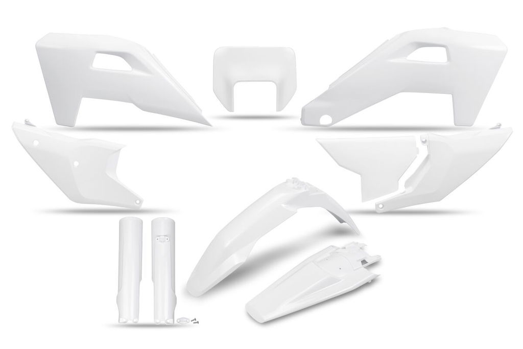 Complete Body Kit for HusqvarnaComplete Body Kit for Husqvarna Full Body kit includes front and rear fender, radiator covers, side panels, fork protectors and front number plate Molded-in colored parts won’t show a different color when scratched Predrilled pieces mount easily to stock Made in Italy