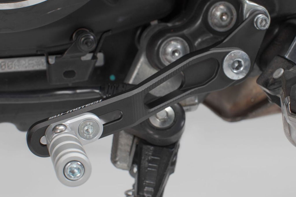 Gear LeverThe tread can also be mounted at a 180° angle Better ergonomics and safe operation of the gear lever A spring mechanism enables it to be folded down and protects it from breaking in case of a crash Robust and elegant: CNC-milled, HART-COAT® coated aluminum Mounting of an extension for gear lever (available separately) for expanding the tread surface possible General Operating License not required for German traffic