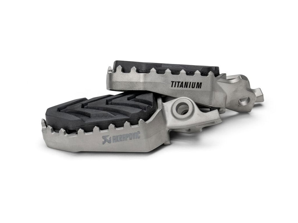 Titanium Foot PegsThese one-piece footpegs were designed with the demanding engineering objectives of high mechanical strength and extremely stable construction, ensuring stability, grip, and comfort for the rider on- and off-road. The central teeth ensure efficient weight distribution and control from the wide surface with a versatile layout. The foot pegs were designed with standing up and heel-down functionality in mind for riders on designated enduro terrain, helping them stay balanced and maintain control and traction when navigating challenging trails. This product has been tested and developed in real conditions. The package also includes a pair of rubber pads. Made out of Grade 5 titanium Fitment notice: The original fitting material must be used during installation of the Akrapovic footpeg set.