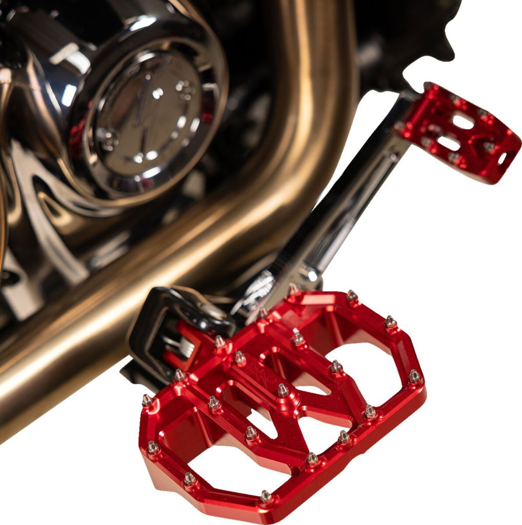 Mini Aggressor FloorboardsDesigned to provide the maximum amount of grip and improve ground clearance while maintaining a sleek and timeless design Featuring 20 cone-shaped stainless steel cleats per floorboard on a mini floorboard shape Improve the look and feel of the motorcycle Billet 6061 aircraft grade aluminum Cone-shaped stainless steel cleats are replaceable Cutaway design for increased ground clearance Aluminum clevis Will not work on 2018 and up M8 softail rear; hits on primary.