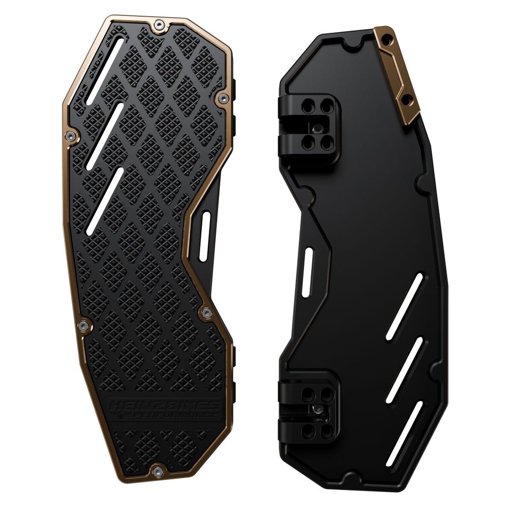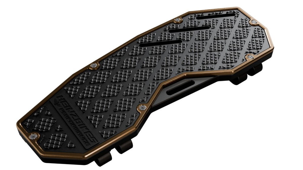 Performance FloorboardsGive your bike the ultimate PERFORMANCE upgrade! With our unique design and highest quality, made from high-grade billet aluminium and CNC milled, they are more robust and lighter than other floorboards on the market, our new HeinzBikes® PERFORMANCE Floorboards. The floorboards have been designed to offer maximum ground clearance without compromising the comfort of the floorboard on your bike. The GRIP surface guarantees maximum grip and a footbed adapted to the shape of your foot gives you full control over the bike, even in extreme situations! The tilt adjustment screw allows you to adjust the riding position to suit your preferences, and the replaceable SlidePad on the underside protects the floorboards even in extreme conditions. CNC-milled from a solid block of 6061 billet aluminium. HeinzBikes® WaterRins for maximum grip even in wet conditions. Aluminium SlidePad on the underside prevents damage to the floorboard in extreme cornering positions (replaceable). Rubber-free for true PERFORMANCE style. Easy installation with OEM mounting hardware. OuterRing in 5 custom colors: black, gold, silver, red, bronze anodized. 6061 Billet Aluminium.