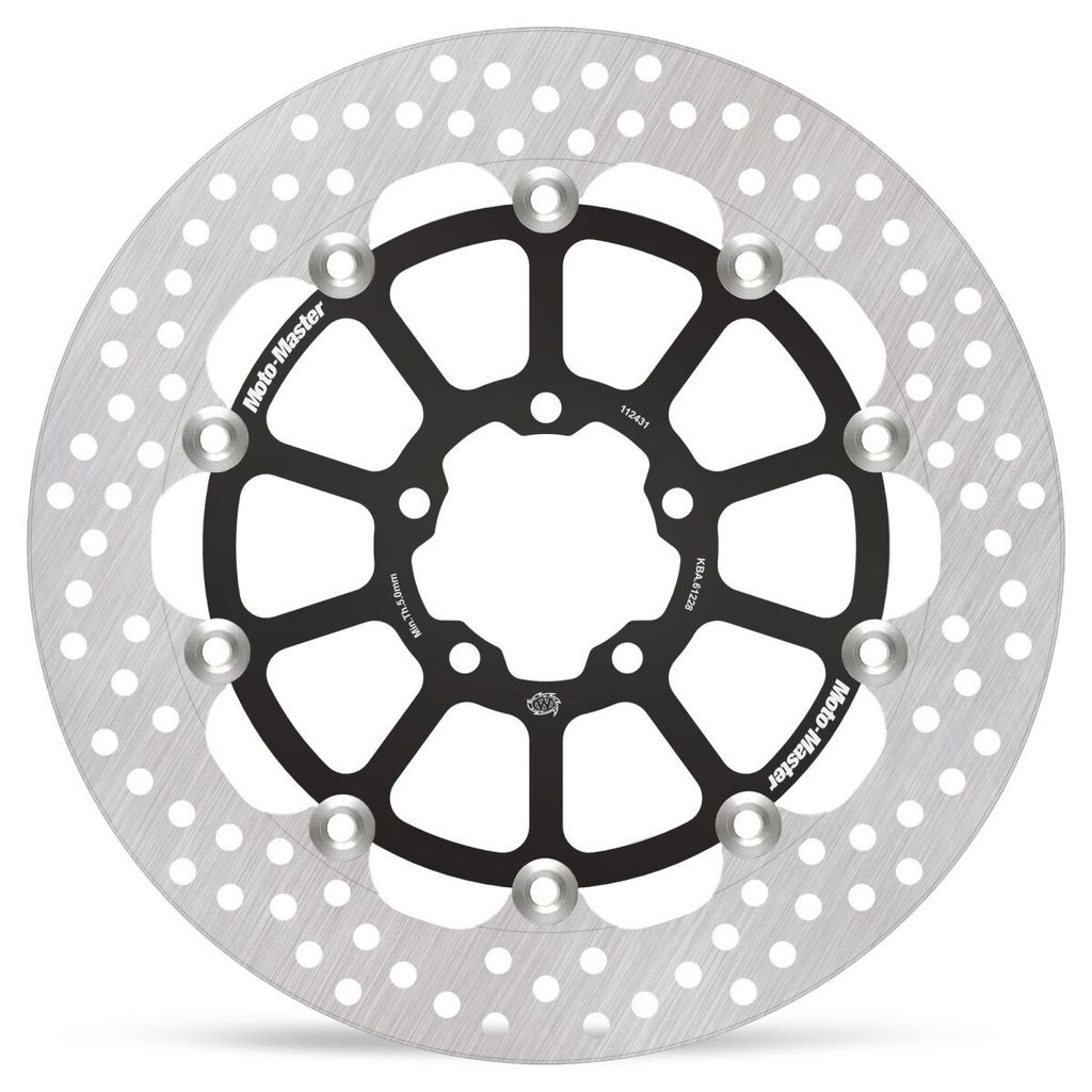 Halo Series Floating Racing RotorA new standard in aftermarket circular-round brake rotors Durable, premium quality stainless steel outer ring is laser-cut and precision-ground Carrier is crafted from CNC-machined billet aircraft aluminum, black anodized and laser marked Venting holes are sized and positioned exactly to ensure equal heat dispersion, even under high thermal stress, while the brake pad contact surface stays clean Lightweight stainless steel floaters complete the package Brake Rotor Floating Racing Halo, Front, KTM 990 Duke 2024