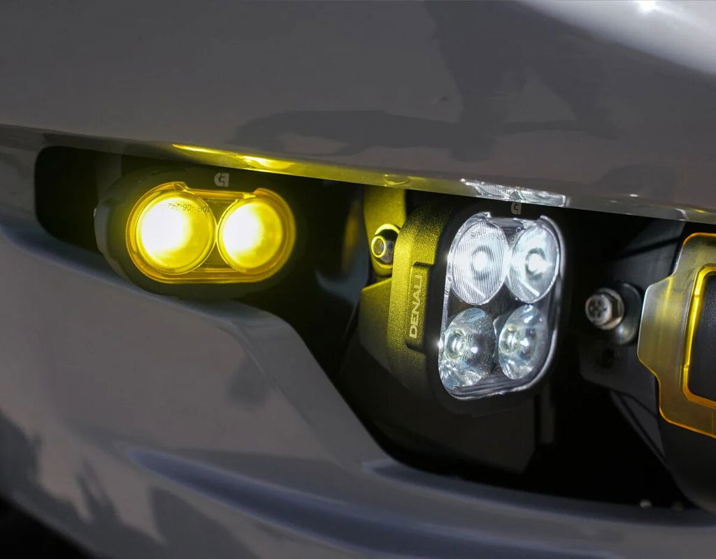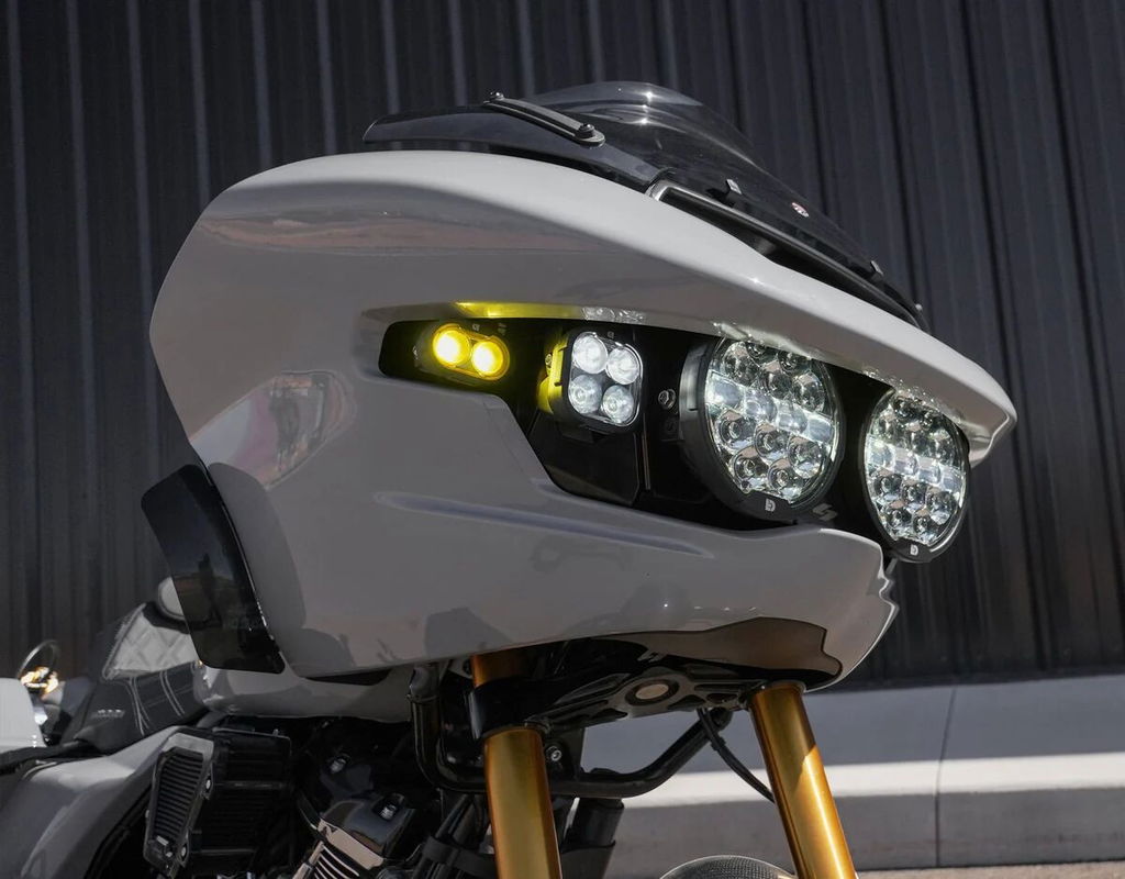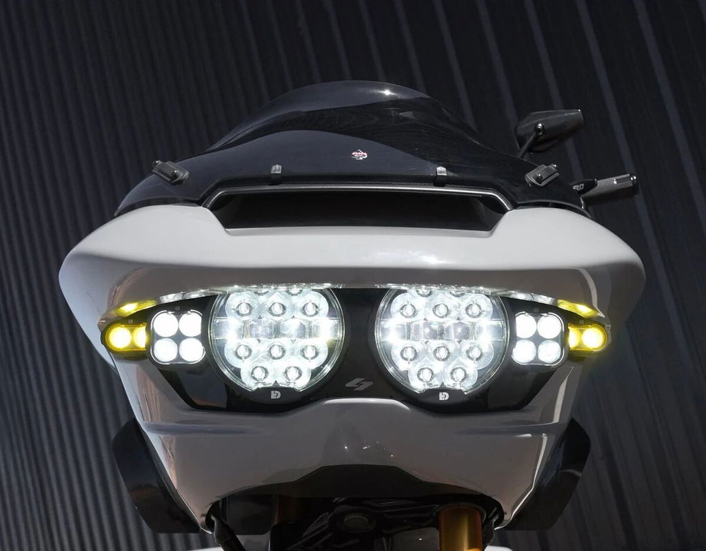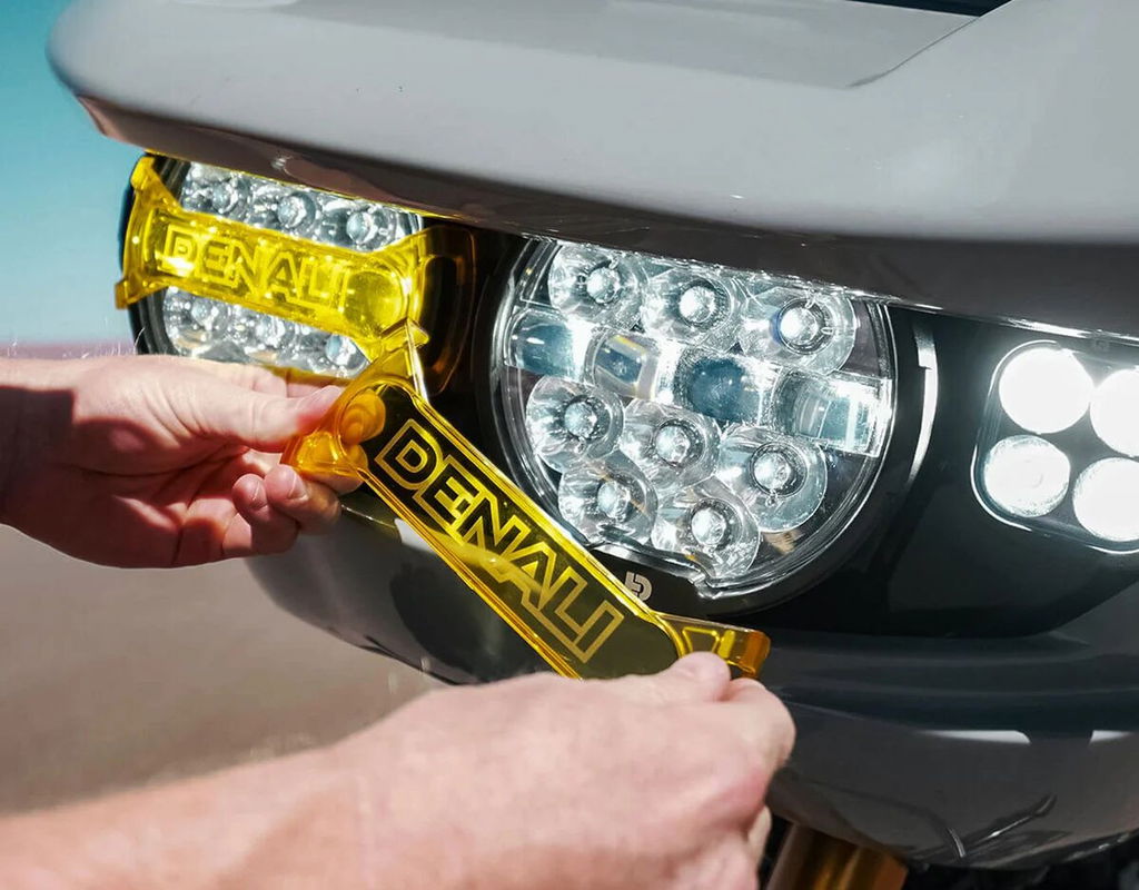 Full Deck Headlight KitThe Full Deck headlight kit is anything but your average headlight upgrade. The clever bracket design by Kraus Moto Co is designed to mount a pair of DENALI D14 Destroyer Headlights, a pair of DENALI DL4 Driving lights, and a pair of yellow DENALI DL2 Driving Lights that flash in sync with the factory turn signals. Complete Plug-&-Play Headlight Upgrade Kit Over 36,000 total lumens Dual High Beam Design (DOT high beam or ECE Destroyer high beam) Modular X-Lens System Ultra-slim Profile IP68 & 69K Waterproof, Submersible, & High-pressure Spray Kit Contents: (2x) D14 Destroyer Headlights – DNL.D14.050 (2x) DL4 Driving Lights - DNL.DL4.050 (2x) Dl2 Yellow Driving Lights - DNL.DL2.050.Y (1x) black powder-coated mounting brackets with hardware (1x) Plug-&-Play Wiring Harness