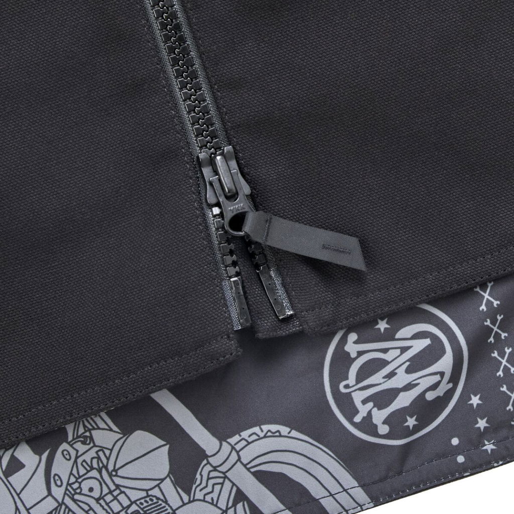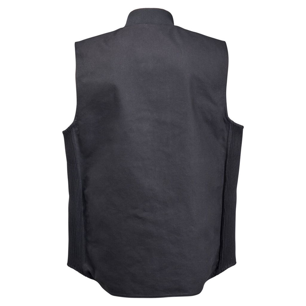 4 Speed VestTough 13 ounce, 100% Cotton canvas exterior. 3 inch wide canvas accordion side panels with stretch nylon/Elastane construction. Vislon two-way weatherproof zipper with high-traction Hypalon pulls. Two lower front pockets have double-needle stitching and riveted corner reinforcements. Oversized hidden pocket on right chest has 8 inch vertical zipper and single patch pocket on left chest. 57% polyester/ 43% Repreve recycled interior liner with sublimated graphic. Woven stretch polyester collar with Spandex to hold shape. Single-needle, double-needle and overlock stitched polyester seams throughout. Embroidered interior tags and external brand detailing. EU: Tough 368,54 gsm, 100% Cotton canvas exterior. EU: 7,62 cm wide canvas accordion side panels with stretch nylon/Elastane construction. EU: Oversized hidden pocket on right chest has 20,32 cm vertical zipper and single patch pocket on left chest.