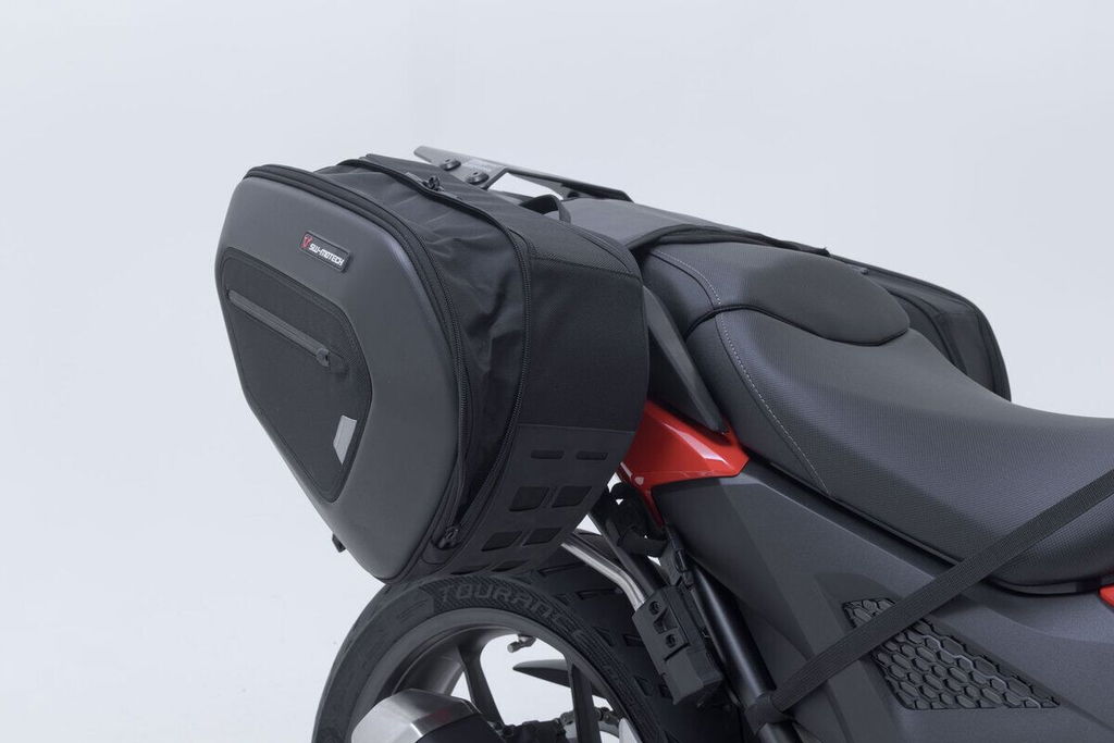PRO BLAZE H Saddlebag SetThe high version of the PRO BLAZE saddlebags was specially developed for motorcycles with a high exhaust pipe. Due to the raised position, the bags are not affected by the heat emitted from the exhaust. SW-MOTECH has manufactured these bags from lightweight and dimensionally stable EVA material. The cover, made of particularly UV-resistant 1680D nylon, protects luggage from splashing water and dust. Developed specifically for sporty motorcycles, the saddlebags have a minimal effect on driving characteristics. When travelling without luggage, the removable support arms can be detached with a simple step, leaving only inconspicuous holders behind on the bike. The bike-specific developed removable support arms, a powerful hook and loop fastener and an additional safety belt with click fastener ensure the best grip and prevent the bags from swinging or flapping - even at high speeds. BLAZE support arms: New improved locking mechanism. Easy attachment of the brackets, even when wearing gloves. Integrated colour indicator shows when the bracket is securely seated in the holder. One-time mounting of the bike-specific, inconspicuous brackets for the removable support arms. Removable support arms attachable and removable in a few simple steps. Material: Stainless steel / Polyamide. Colour: silver / black. Total Weight: appr. 1,2 kg / appr. 2.7 lb. Saddlebags PRO BLAZE H: Specially designed for motorcycles with a high-mounted original exhaust. PRO BLAZE saddlebags with bike-specific support arms allow you to convert sporty bikes to touring motorcycles in seconds. Light weight and sporty look. Side walls made of dimensionally stable, laminated EVA plastic. Made from durable, highly UV-resistant 1680D ballistic nylon with water resistant interior coating. A powerful Velcro strap additionally secures the left and right saddlebags and offsets the weight of the luggage. Upper side of the Velcro strap covered with anti-slip material for a secure hold on the passenger seat. Zippered volume expansion. Main pocket is loaded from the top. Outer pocket with covered zipper. MOLLE attachment made of sturdy Hypalon material on the front for accessory bags. Practical carrying handle. Reflective details for more safety in traffic. Material: 1680D ballistic nylon. Colour: black / anthracite. Size: 46,0 x 18,0 x 32,0 cm / 18.1 x 7.1 x 12.6 in. Total Weight: appr. 1,5 kg / appr. 3.3 lb. Total Volume: 15,0-20,0 l (each bag). Scope of delivery: 2 x Saddlebags PRO BLAZE H, 2 x BLAZE support arms, 2 x waterproof inner pockets, 1 x Paint protection film, Mounting instructions & Mounting material.
