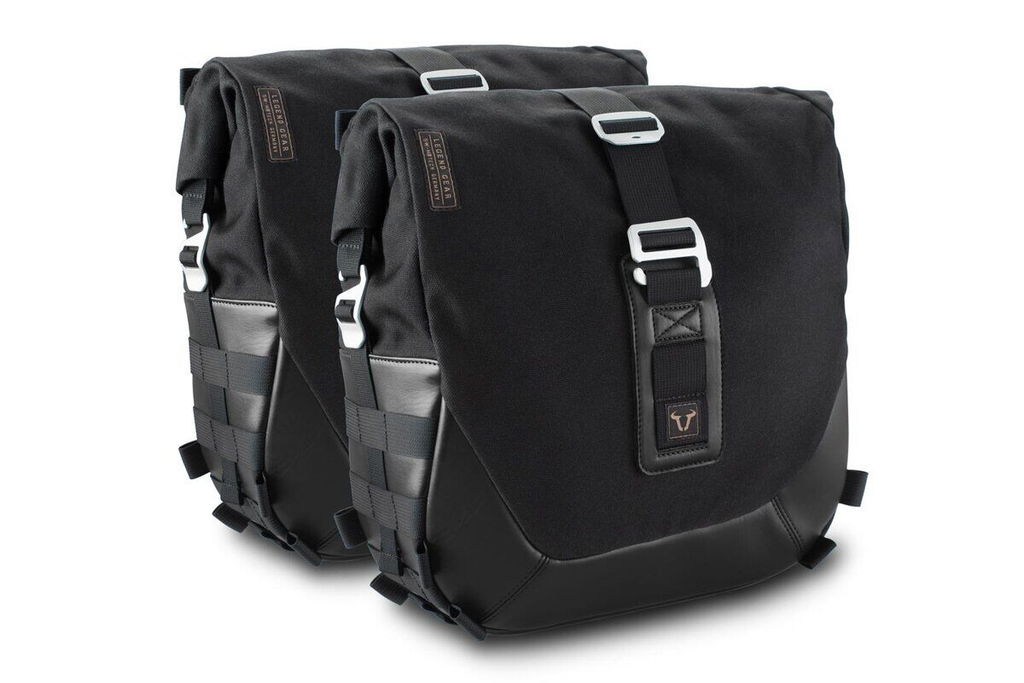 Legend Gear LC2 Side Bag System Black EditionOur bike-specific side bag sets are adapted for tail shape and exhaust height and demonstrate the best combination of the Legend Gear Side Bags. The side bags combine classic appearance and contemporary handling. These bags are easy to attach and detach on the SLC side bag carrier using a quick lock system. SLC Carrier Left & Right Side: Side carrier adapts perfectly to your motorcycle's look. Bike-specific development ensures the best fit. The adapter kit is included in delivery. Material: Steel. Surface: powder coated. Colour: black. Total Weight: appr. 1,0 kg / appr. 2.2 lb (each one). Legend Gear Side Bag LC2 Right & Left: For clicking onto the left and right SLC side carrier. Quick release attachment made from fiberglass-reinforced polyamide enables attachment and removal of the Legend Gear LC side bag within seconds. Rain protection thanks to the roll closure, water-resistant material and waterproof inner bag. Numerous loops for individual attachment of the Legend Gear LA1 and LA2 accessory bags (sold separately, parts 35120273 & 35120274) and the Legend Gear LA3 smartphone pouch (sold separately, part number 35120319). Straps for attaching the Legend Gear LA4 shoulder strap (sold separately, part number 39200466). Light weight with attractive design. Material: Napalon synthetic leather and waxed canvas with water-repellent PU coating. Waterproof inner bag made of 210D Polyamide & double PU coating. Surface: waxed. To protect the natural fibres from the influences of weather, we recommend treating the cotton fabric surface of the product with a commercially available wax waterproofing at regular intervals or after intensive cleaning. Colour: Black. Size: 31,0 x 14,0 x 35,0 cm / 12.2 x 5.5 x 13.8 in. Total Weight: appr. 1,1 kg / appr. 2.4 lb (each bag). Total Volume: 13,5 Liters (each bag). Scope of delivery: 1 x Legend Gear Side bag LC2 right, 1 x Legend Gear Side bag LC2 left, 2 x Waterproof inner bags, 1 x SLC Side carrier left, 1 x SLC Side carrier right side, Mounting instructions & Mounting material.