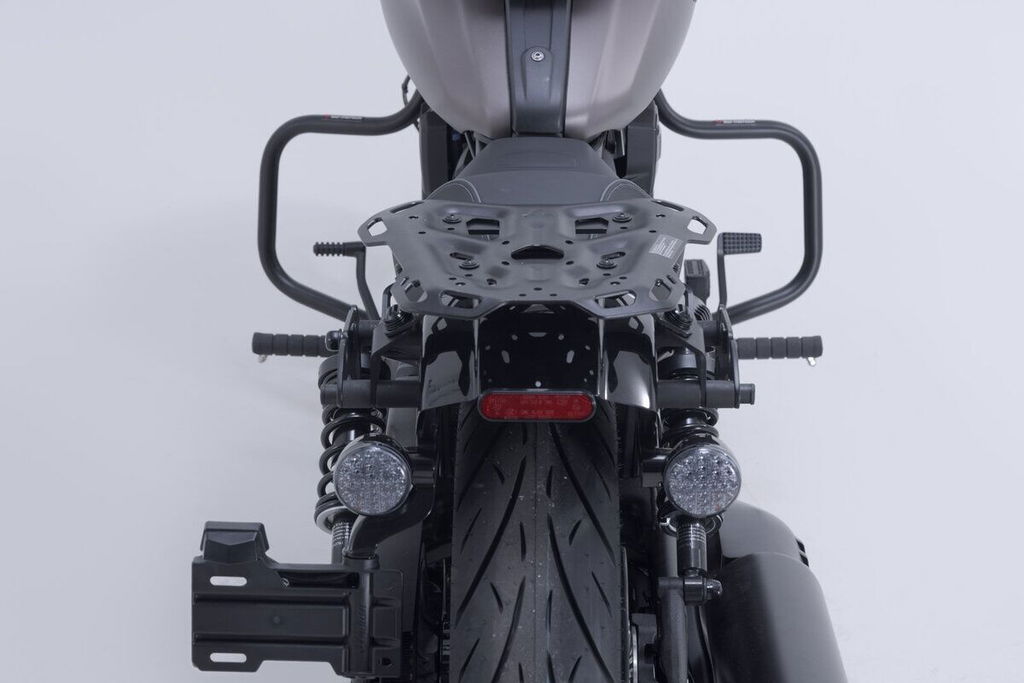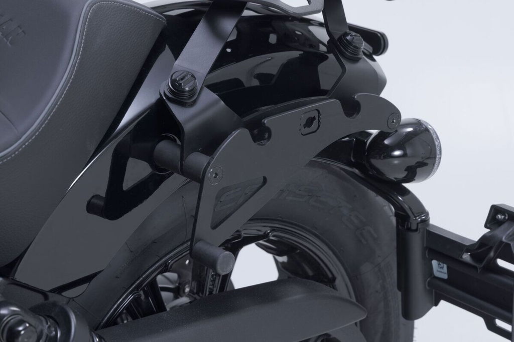 SLH Side Carrier LH1 (Left)The bike-specific bag carrier can be easily and quickly mounted on to original attachment points on the fender strut. The quick lock system allows LH Legend Gear side bags to be attached and removed in just a few easy hand movements, without the driver foregoing reliable bag fastening. Material: Steel. Surface: powder coated. Colour: Black. Total Weight: appr. 0,7 kg / appr. 1.6 lb. Scope of delivery: 1 x SLH Side carrier LH1 left, Mounting instructions & Mounting material. Stainless Steel.