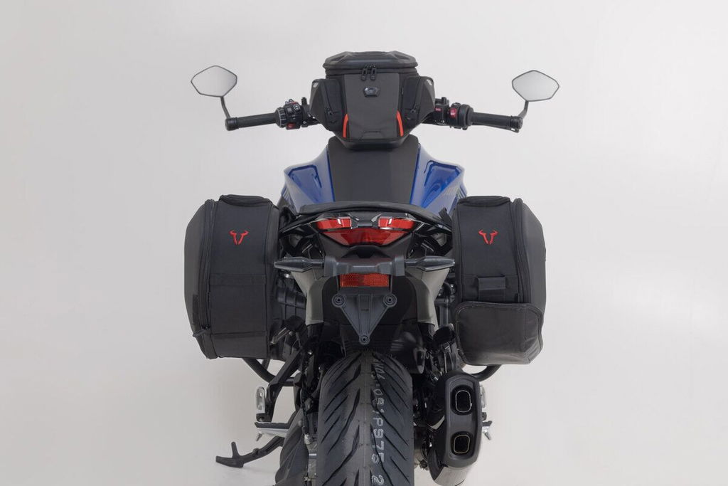 PRO BLAZE H Saddlebag Set with EDGE Protection & Heat GuardThe high version of the PRO BLAZE saddlebags was specially developed for motorcycles with a high exhaust pipe. Due to the raised position, the bags are not affected by the heat emitted from the exhaust. SW-MOTECH has manufactured these bags from lightweight and dimensionally stable EVA material. The cover, made of particularly UV-resistant 1680D nylon, protects luggage from splashing water and dust. Developed specifically for sporty motorcycles, the saddlebags have a minimal effect on driving characteristics. When travelling without luggage, the removable support arms can be detached with a simple step, leaving only inconspicuous holders behind on the bike. The bike-specific developed removable support arms, a powerful hook and loop fastener and an additional safety belt with click fastener ensure the best grip and prevent the bags from swinging or flapping - even at high speeds. BLAZE support arms: New improved locking mechanism. Easy attachment of the brackets, even when wearing gloves. Integrated color indicator shows when the bracket is securely seated in the holder. One-time mounting of the bike-specific, inconspicuous brackets for the removable support arms. Removable support arms attachable and removable in a few simple steps. Material: Stainless steel / Polyamide. Colour: silver / black. Total Weight: appr. 1,2 kg / appr. 2.6 lb. PRO BLAZE H Saddlebags: PRO BLAZE saddlebags with bike-specific support arms allow you to convert sporty bikes to touring motorcycles in seconds. Light weight and sporty look. Side walls made of dimensionally stable, laminated EVA plastic. Made from durable, highly UV-resistant 1680D ballistic nylon with water resistant interior coating. A powerful Velcro strap additionally secures the left and right saddlebags and offsets the weight of the luggage. Upper side of the Velcro strap covered with anti-slip material for a secure hold on the passenger seat. Zippered volume expansion. Main pocket is loaded from the top. Outer pocket with covered zipper. MOLLE attachment made of sturdy Hypalon material on the front for accessory bags. Practical carrying handle. Reflective details for more safety in traffic. Material: 1680D ballistic nylon. Colour: black / anthracite. Size: 46,0 x 18,0 x 32,0 cm / 18.1 x 7.1 x 12.6 in. Total Weight: appr. 1,5 kg / appr. 3.3 lb. Total Volume: 15,0-20,0 l (each bag). Edge protection for BLAZE saddlebags: Abrasion protection for motorcycles with angular tail shapes. For BLAZE saddlebags. Self-adhesive backing. Can be cut to size. Material: Rubber. Material strength: 1,00 cm / 0.39 in. Colour: black. Size: 12,5 x 12,5 cm / 4.9 x 4.9 in. Total Weight: appr. 0,1 kg / appr. 0.1 lb Heat Guard Right: The heat guard protects PRO BLAZE saddlebags from all hot exhaust jets, whether while driving or standing. The textile moulding is ultra heat-resistant and matches the shape of the bags. The heat guard is attached to the underside of the PRO BLAZE saddlebags using Velcro straps. Colour: black. Total Weight: appr. 0,2 kg / appr. 0.5 lb. Scope of delivery: 2 x Saddlebags PRO BLAZE, 2 x BLAZE support arms, 2 x Edge protection for BLAZE saddlebags, 2 x waterproof inner pockets, 1 x Heat Guard Right, 1 x Paint protection film, Mounting instructions & Mounting material. 1680D Ballistic Nylon, Stainless steel & Polyamide.
