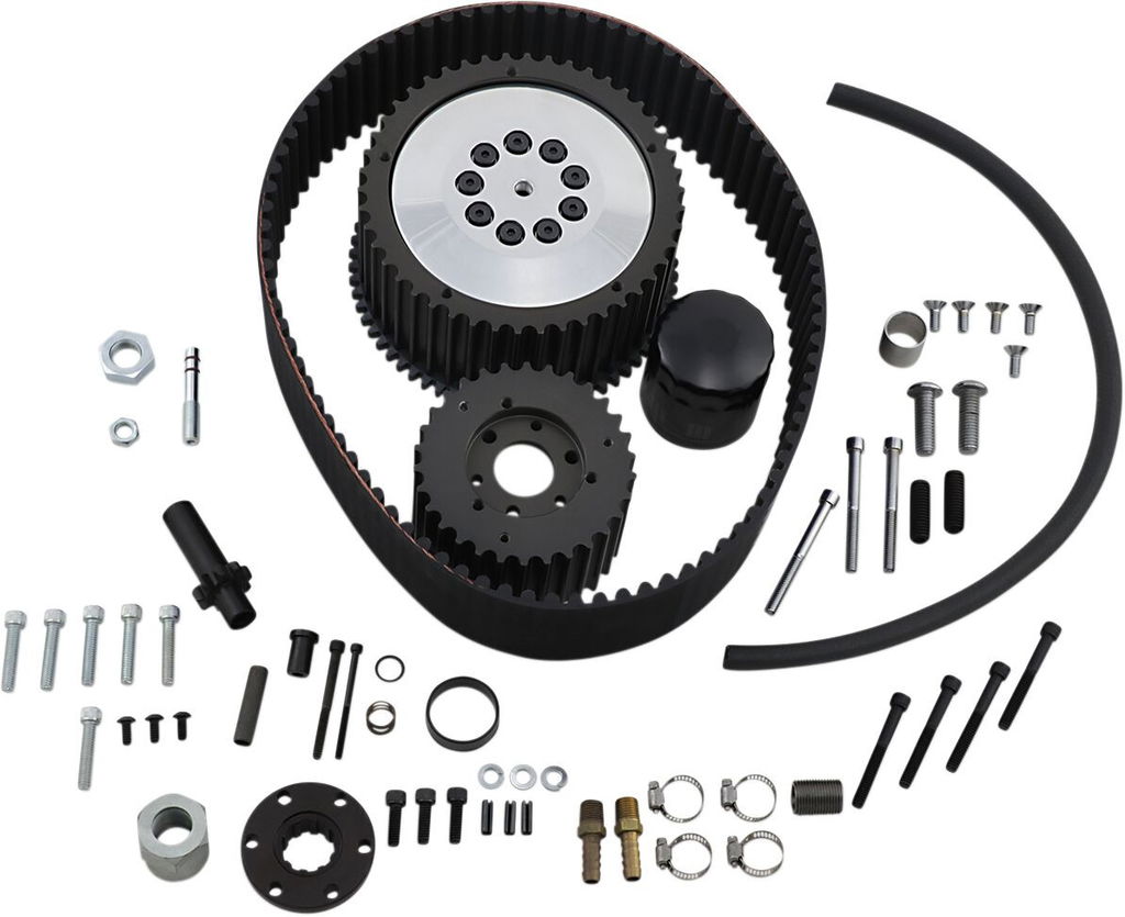 Monster Top Fuel Belt Drive Kit with ClutchKit includes front and rear pulley, 3-3/8" belt, nine aramid friction plates and eleven steel clutch plates; use up to nine springs for varying pressure to accommodate any motor size Includes oil filter mount between the pulleys Made in the USA Systems are not designed for use with floorboards. Replacement components available separately.
