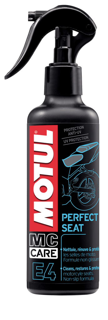 Non-silicone based cleaner spray for removing incrusted dirt and grime and for protecting motorbike, scooter and ATV saddles. Renovating effect, particularly recommended for bringing back the original finish and restoring like-new color and shine to all vinyl saddles.